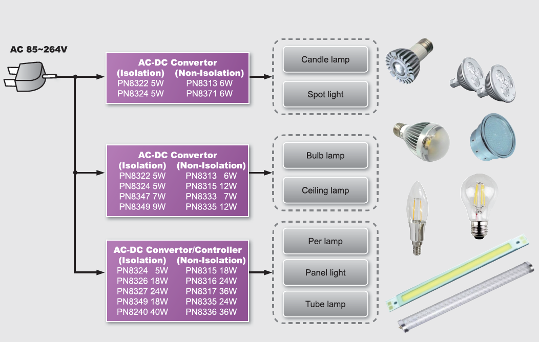 我们可以为您的LED照明灯具提供1-40W隔离/非隔离的较完整的AC/DC解决方案,包括双绕组内置高压启动的3-5W系列、单级PFC内置开关MOS及高压启动的7-20W系列、单级PFC外置MOS的40W控制器系列。Chipown日益完善的LED照明IC家族将为您提供极高性价比、性能优异、品质稳定的各类LED驱动配套方案。