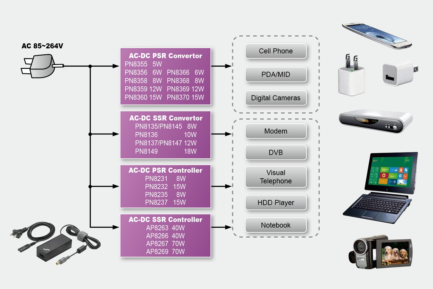 Chipown在适配器和充电器领域具备比较完整功率段的AC/DC电源芯片产品。我们可以为您提供5-10W内置高压启动及功率管的PSR系列、10-18W内置高压启动及功率管的Flyback系列、15-90W外置MOS控制器系列等多种架构的产品,并提供高性价比、性能优异、品质稳定的Adapter/Charger系统参考设计方案。
